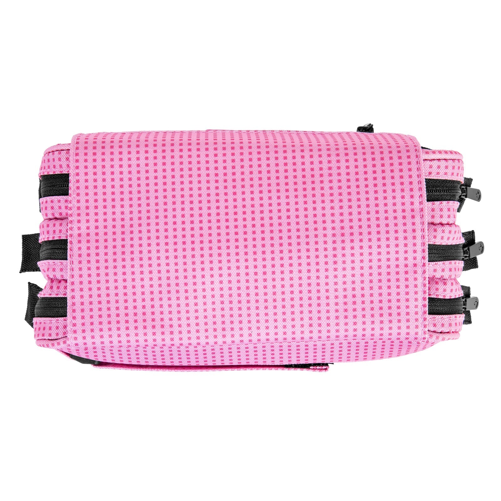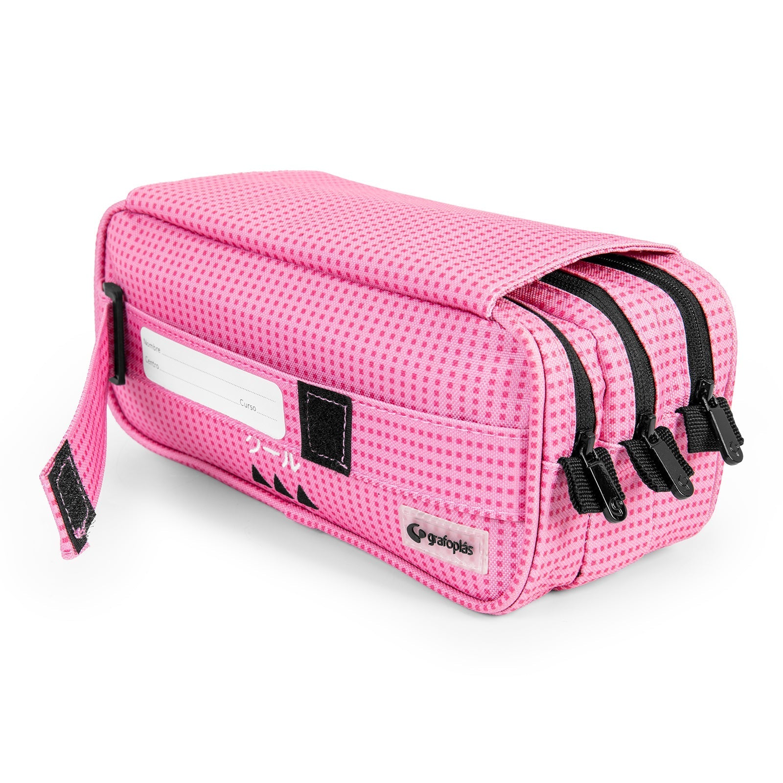 Estuche portatodo triple de amplios apartados y gran capacidad en formato rectangular. Cuenta con 3 cremalleras principales y una solapa exterior con tirador de tela y cierre de velcro. Además, cuenta con una tira trasera para poder colgarlo y con espacio para tus datos.