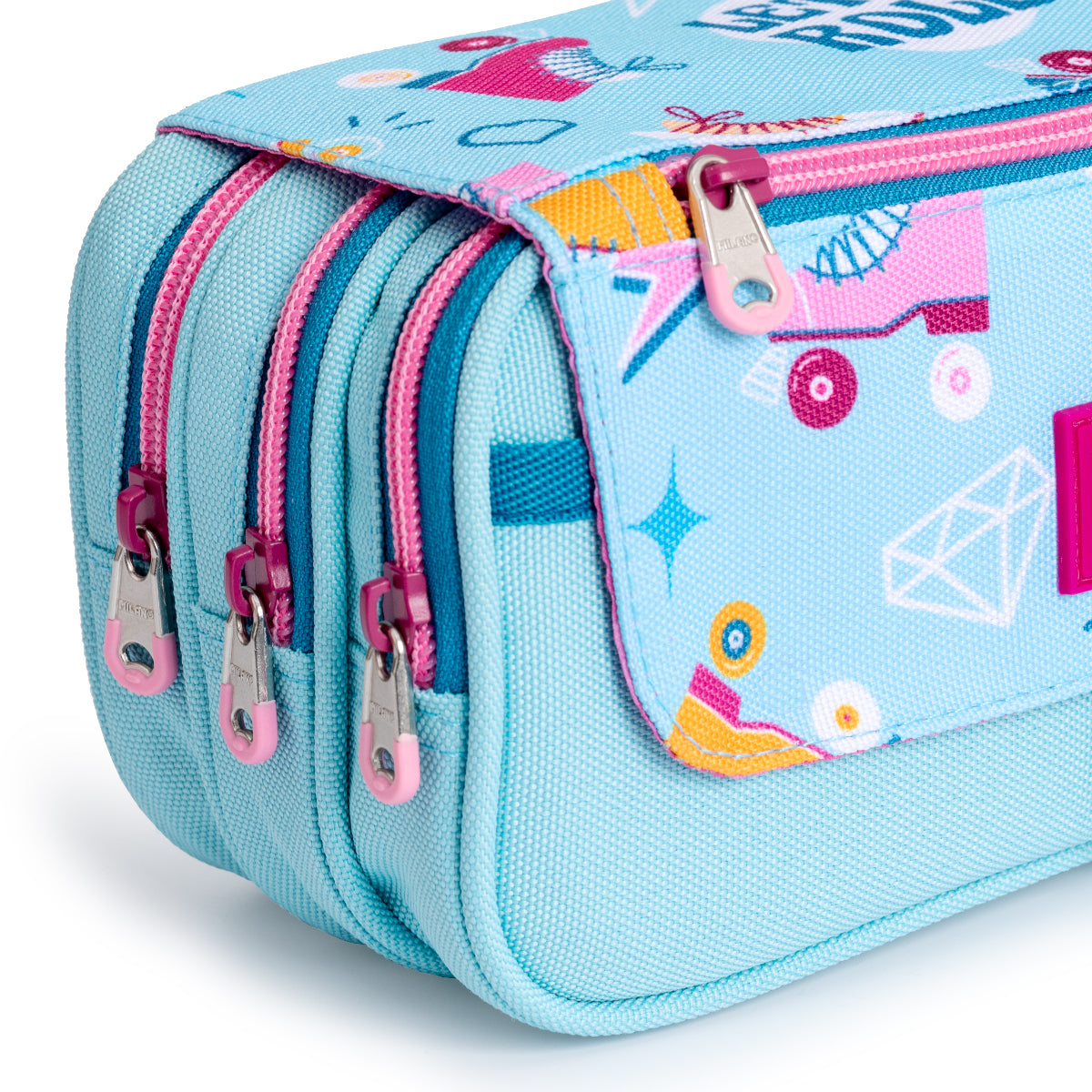 Estuche portatodo triple MILAN Roller, de amplios apartados y gran capacidad. Cuenta con 4 cremalleras, 3 principales y otra en la solapa una solapa exterior que incluye tirador de tela y cierre magnético de botón. Cierres de cremallera ancha y resistentes con tiradores metálicos con recubrimiento de goma para mayor confort. Fabricado 100% en Poliéster. Medidas: 24 x 13 x 10 cm.