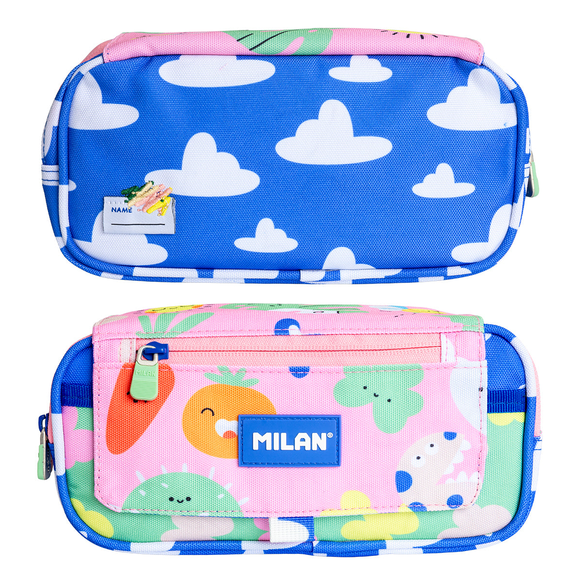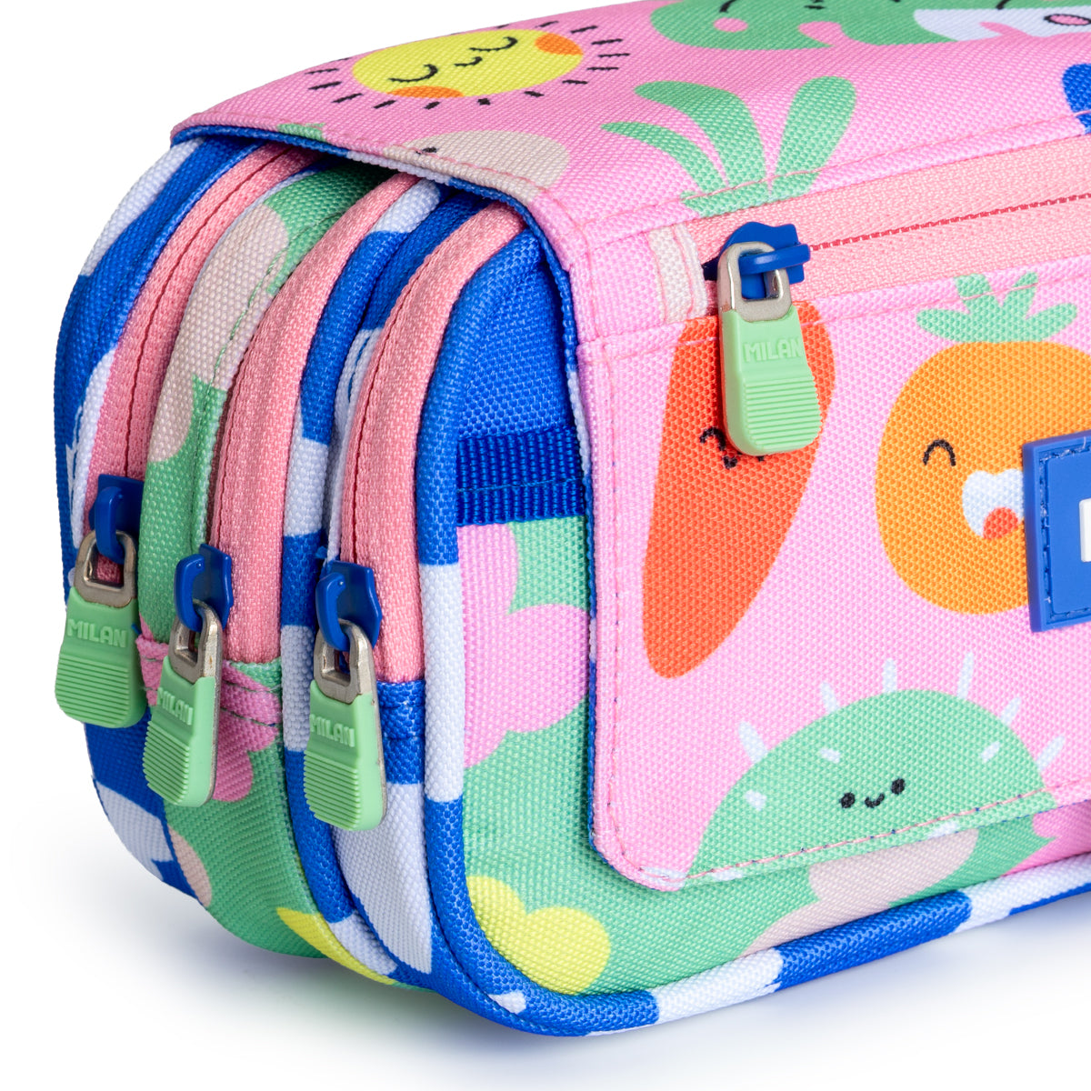 Estuche portatodo triple MILAN Green & Grow, de amplios apartados y gran capacidad. Cuenta con 4 cremalleras, 3 principales y otra en la solapa una solapa exterior que incluye tirador de tela y cierre magnético de botón. Cierres de cremallera ancha y resistentes con tiradores metálicos con recubrimiento de goma para mayor confort.