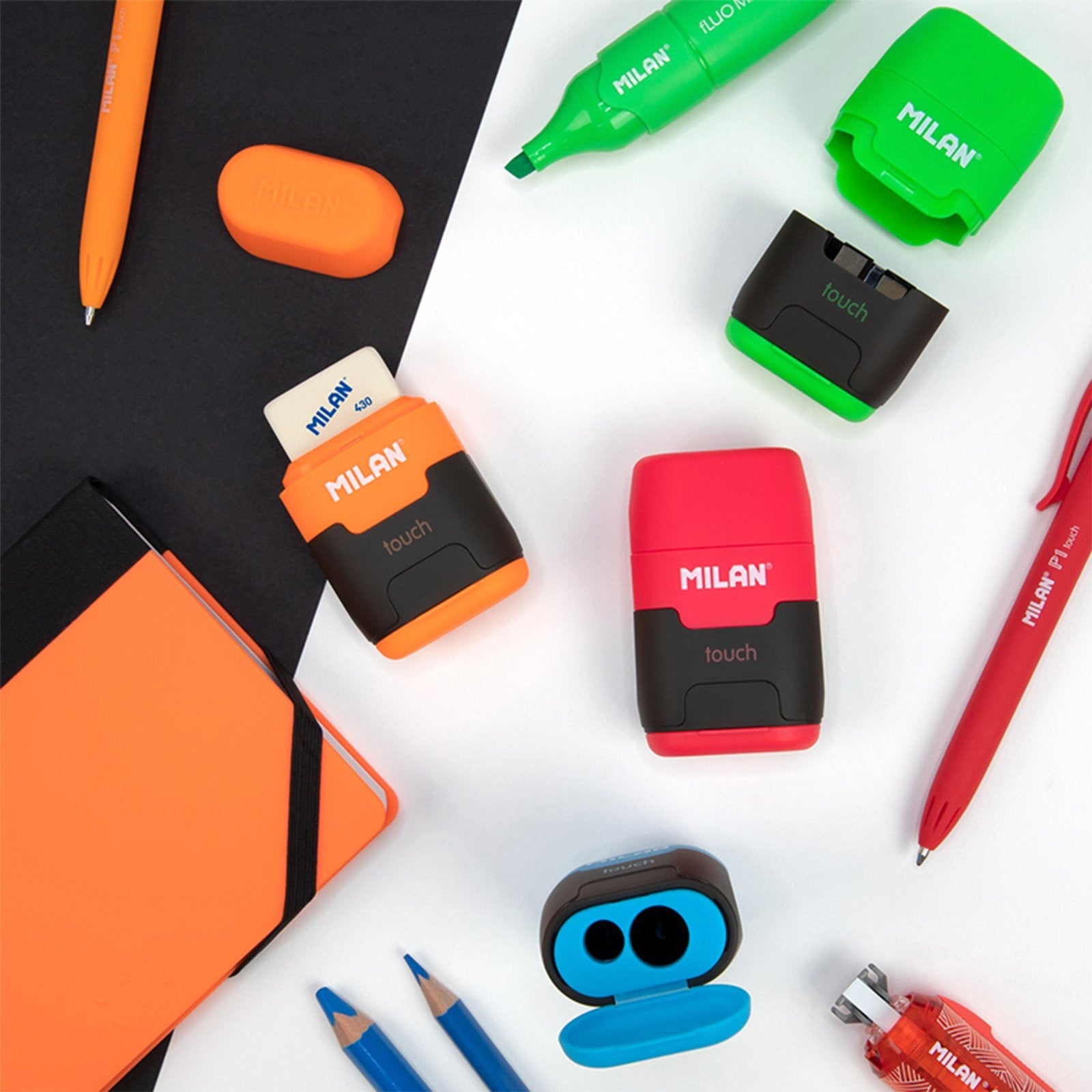 Combinación de goma y sacapuntas doble (uno estándar y otro MAXI). Goma cuadrada suave de caucho sintético tipo "miga de pan". El sacapuntas tiene una cuchilla de acero al carbono afilada y resistente, ideal para todo tipo de lápices. Artículo con cuchilla de seguridad. Este sistema evita que se pueda separar la hoja del cuerpo del sacapuntas, siendo óptimo para uso escolar y para llevar en el estuche. Diseñado en España por el propio departamento de I+D de MILAN. Colores surtidos disponibles: rojo, verde, naranja y azul.