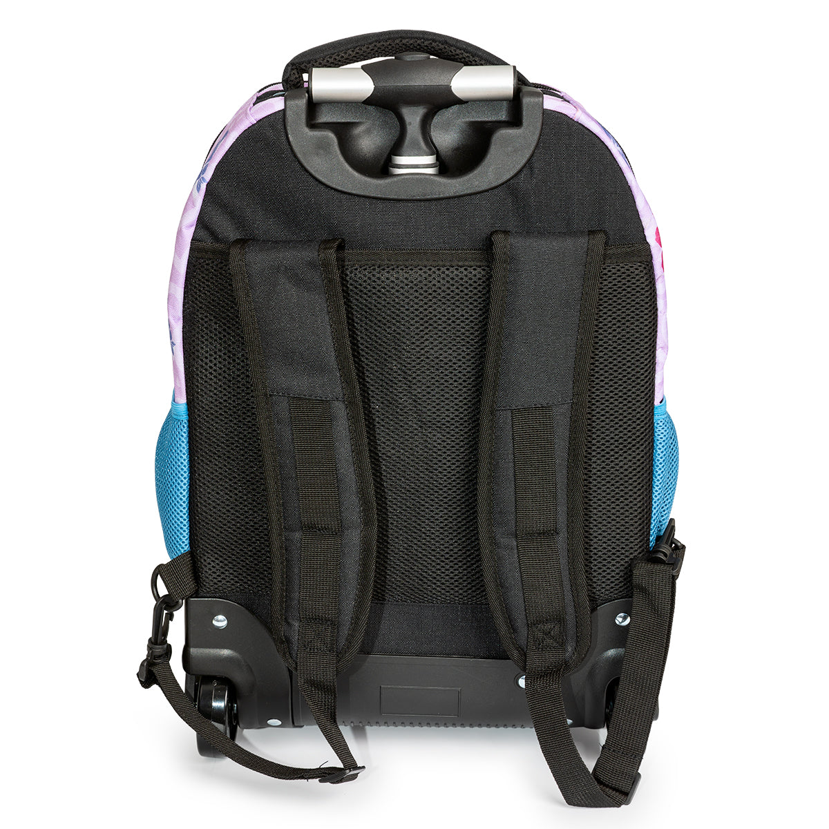 Mochila escolar con 2 ruedas integradas. Dos compartimentos, un bolsillo frontal y dos bolsillos laterales de red. Interior con forro y bolsillo acolchado para dispositivos electrónicos. Correas al hombro para llevar como mochila.
