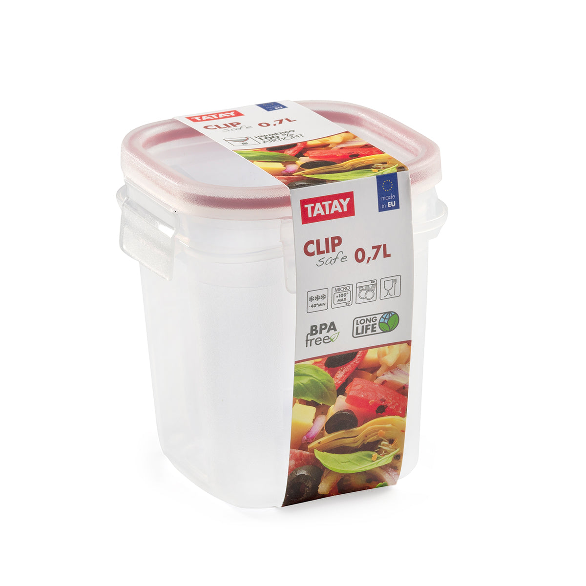 Recipiente hermético para alimentos cuadrado de 0.7L TATAY Clip Safe fabricado en plástico polipropileno, un material muy resistente, reciclable, y apto para la alimentación. Además, es muy fácil de limpiar.