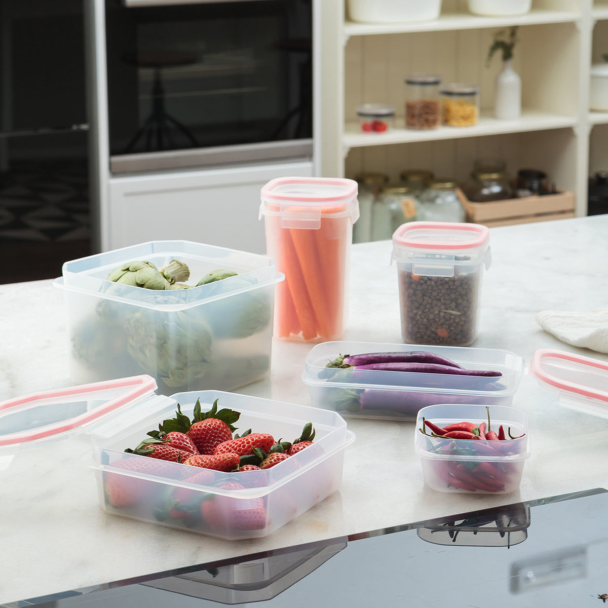 Cuenta con cuatro cierres de bloqueo y junta de silicona en color rojo, para asegurar su hermeticidad. Gran capacidad, ideal para almacenar o transportar en él cualquier tipo de alimento.