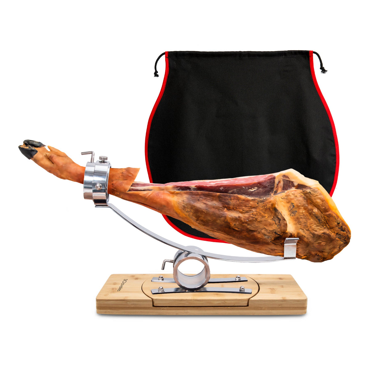 Apto para cualquier tamaño de Jamón con un fácil acceso a todas las partes del jamón mejorando el rendimiento de la pieza. Profesionales del sector como J.M. Hidalgo, maestro cortador y Campeón de España, recomiendan el soporte basculante 3 Claveles por su confort de uso y fácil manejo. Incluye una funda cubre jamón profesional de talla única (55 x 54 cm), con un diseño moderno y elegante. Fabricada en un material resistente, duradero y muy fácil de limpiar compuesto por un 70% algodón y un 30% poliéster y cordón ajustable. Permite que tu pata y paleta respire y mantenga sus propiedades sin secarse durante más tiempo.