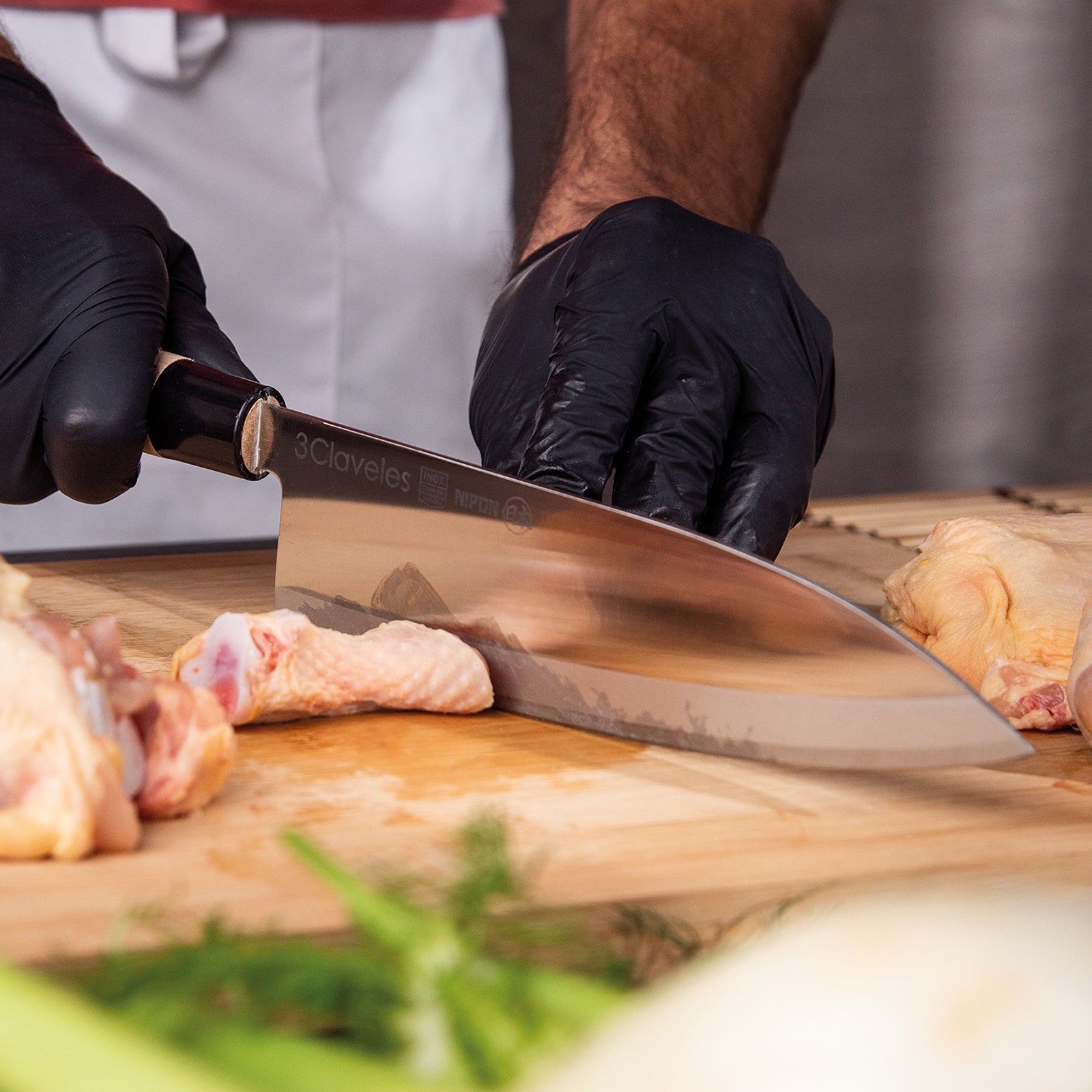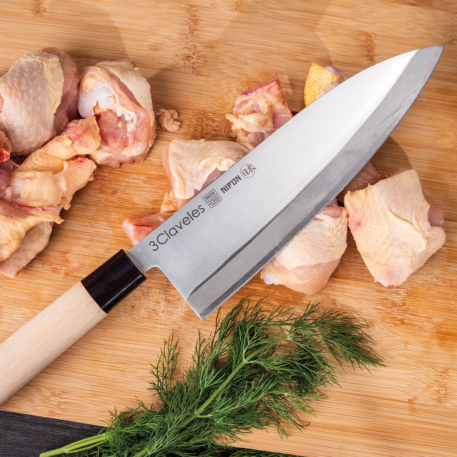 Cuchillo profesional Deba de 210 mm de la gama 3 Claveles NIPON de estilo japonés, donde predominan las líneas rectas en la forma del mango, pensado para el uso diario sin renunciar al diseño. Diseñado para filetear y cortar principalmente pescado. También se usa para el corte de diversas carnes y aves en la parte ancha. Especial para realizar cortes precisos y profundos por el filo en un solo lado al estilo tradicional de la cocina asiatica.