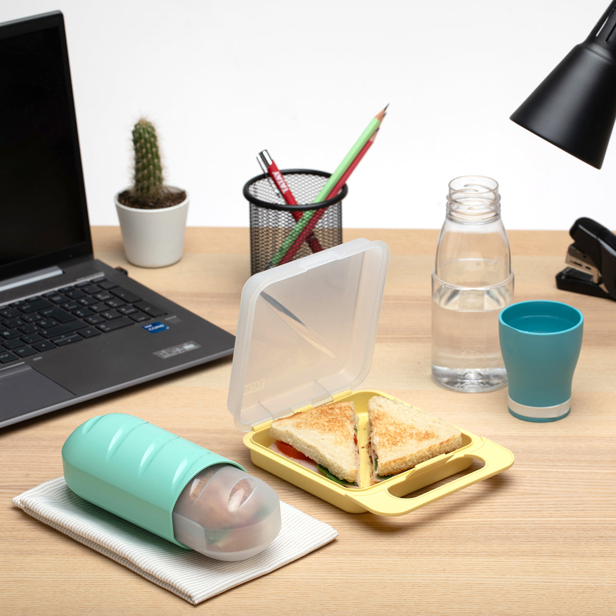 Porta bocadillos infantil extensible TATAY fabricado en plástico PP05, reciclable, higiénico y libre de BPA, totalmente libre de toxicos. Es muy útil para llevar tu bocadillo protegido, además de para evitar el uso de envoltorios de usar y tirar. Larga vida util por su diseño.