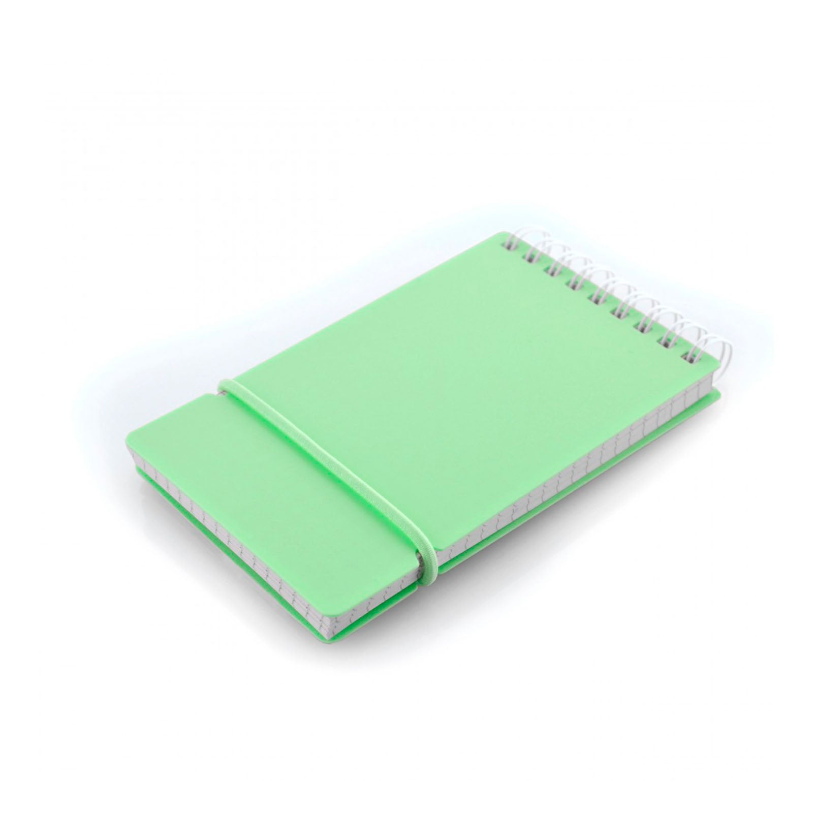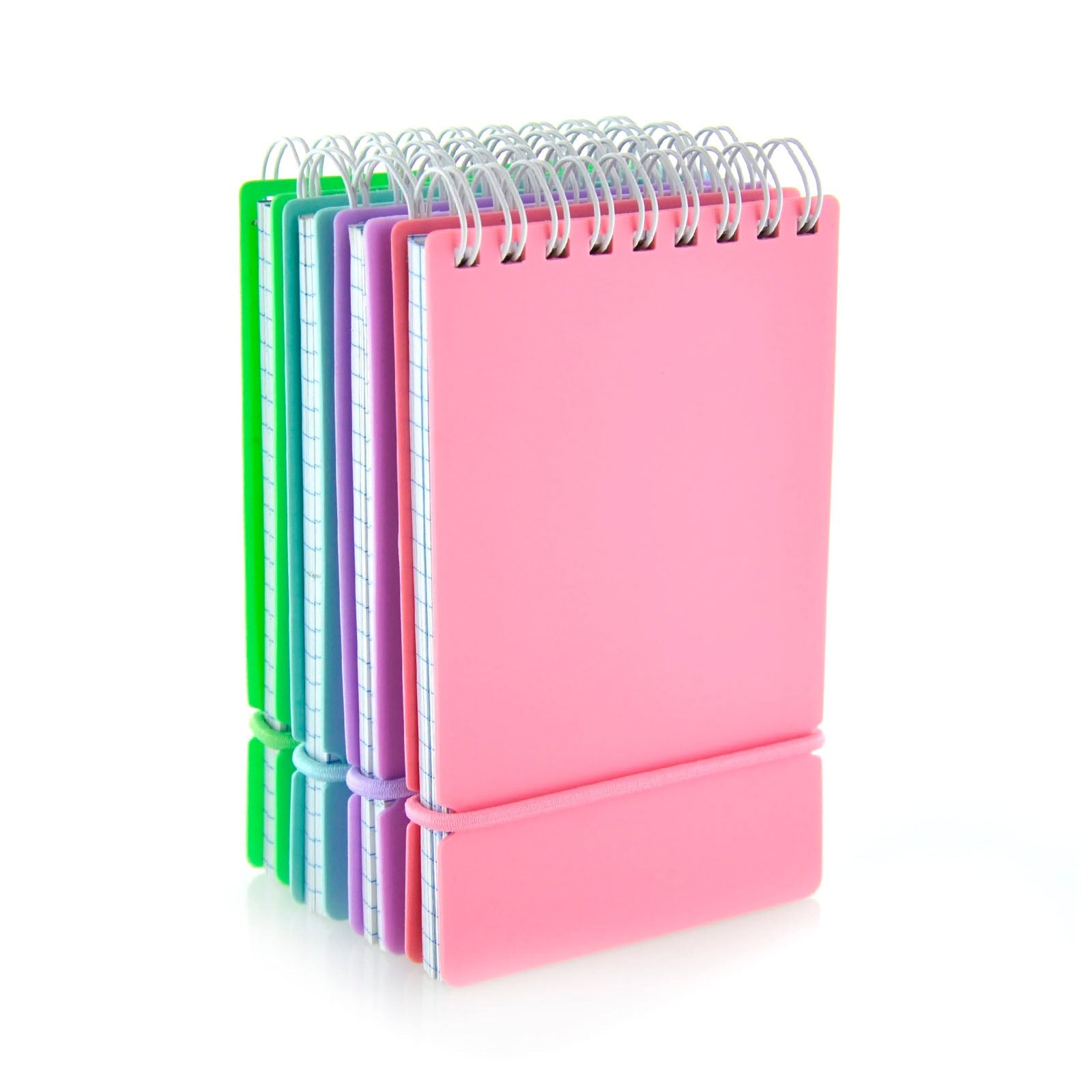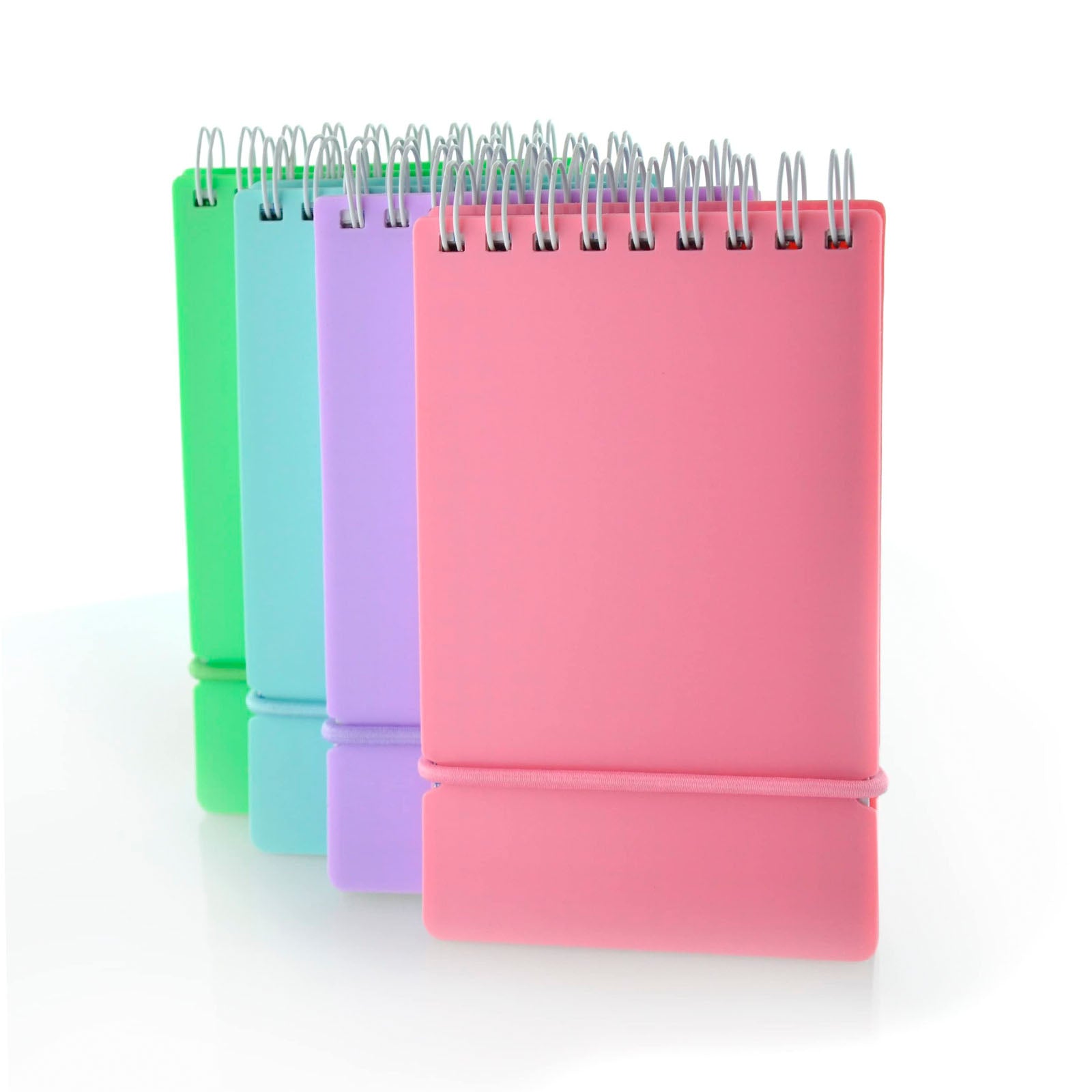 Set de 4 blocs de notas cuadriculados tamaño DIN A7 de colores azul, rosa, morado y verde pastel, con la tapa de plástico flexible, la sujeción con doble espiral metálica y un cierre de goma redonda por el exterior. Referencia: 85705