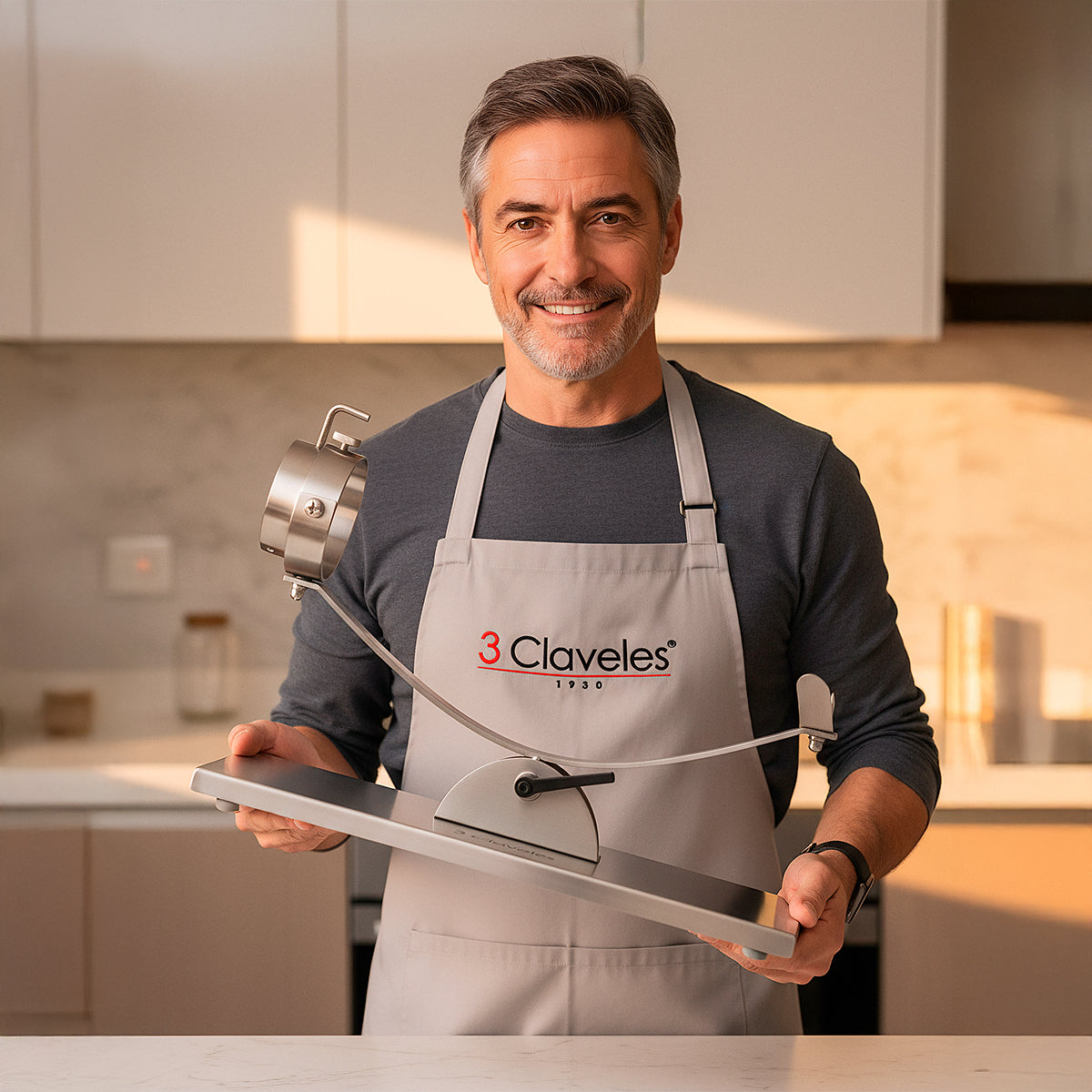 Soporte jamonero basculante con cabezal giratorio 3 Claveles fabricado en acero inoxidable y balancin reforzado. Su forma y diseño facilitan el corte del jamón en cualquier ángulo. El soporte es de acero inoxidable y los herrajes y pinchos son de acero cromado. Corte cómodo y ergonómico para el usuario. Diseño basculante exclusivo de 3 Claveles.