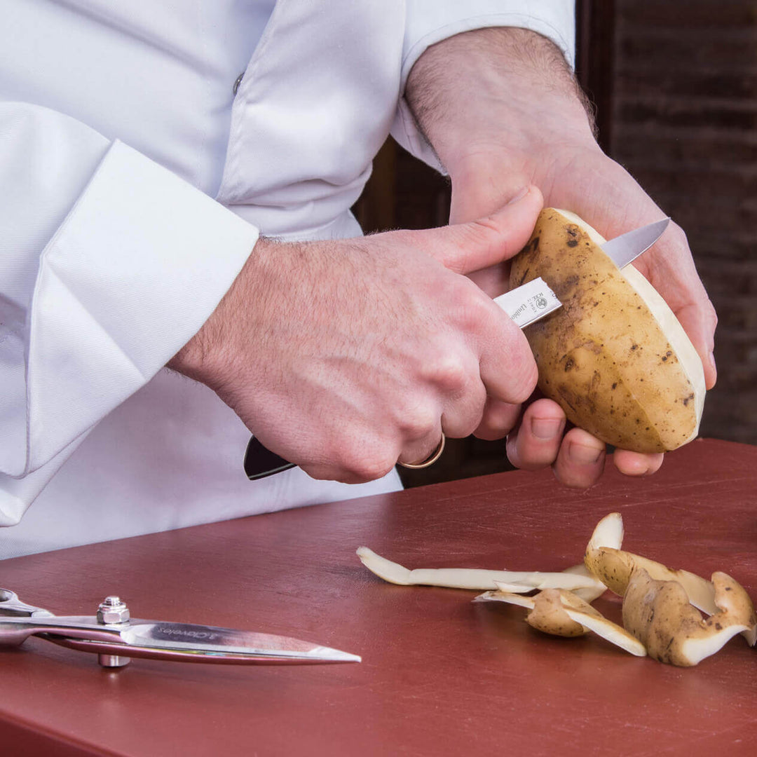 Cuchillo Santoku de hoja de 18 cm, ideal para preparar carne, pescado y verdura. Certificación NSF Internacional (National Sanitary Foundation). Se recomienda lavar a mano con productos neutros y secar inmediatamente.