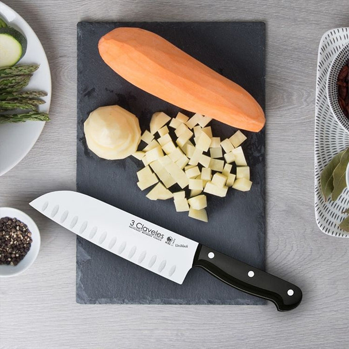 Cuchillo profesional Santoku alveolado 3 Claveles Uniblock ref. 1122, el multiusos de la cocina asiática, con acabado pulido semi mate. Hoja de Acero Inoxidable Molibdeno Vanadio y Mango en POM (polioximetileno) negro.