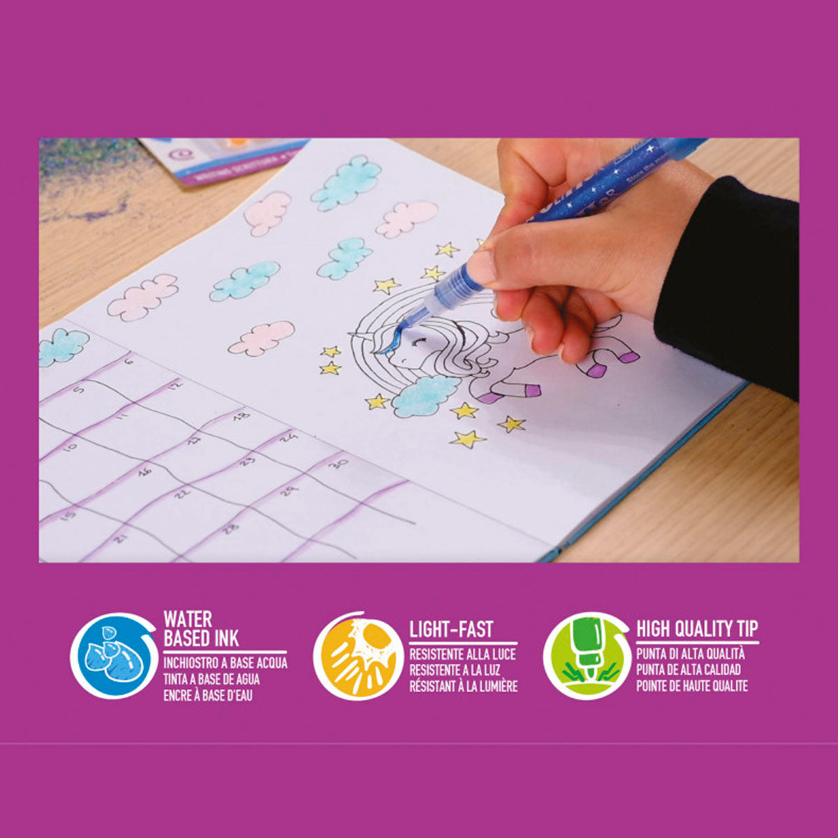 La tinta seca muy rápido y permite una escritura deslizante ideal para decorar cualquier dibujo. Colores brillantes y cubrientes. Colores incluidos: rojo, amarillo, verde, azul, violeta y gris. Referencia: 42190