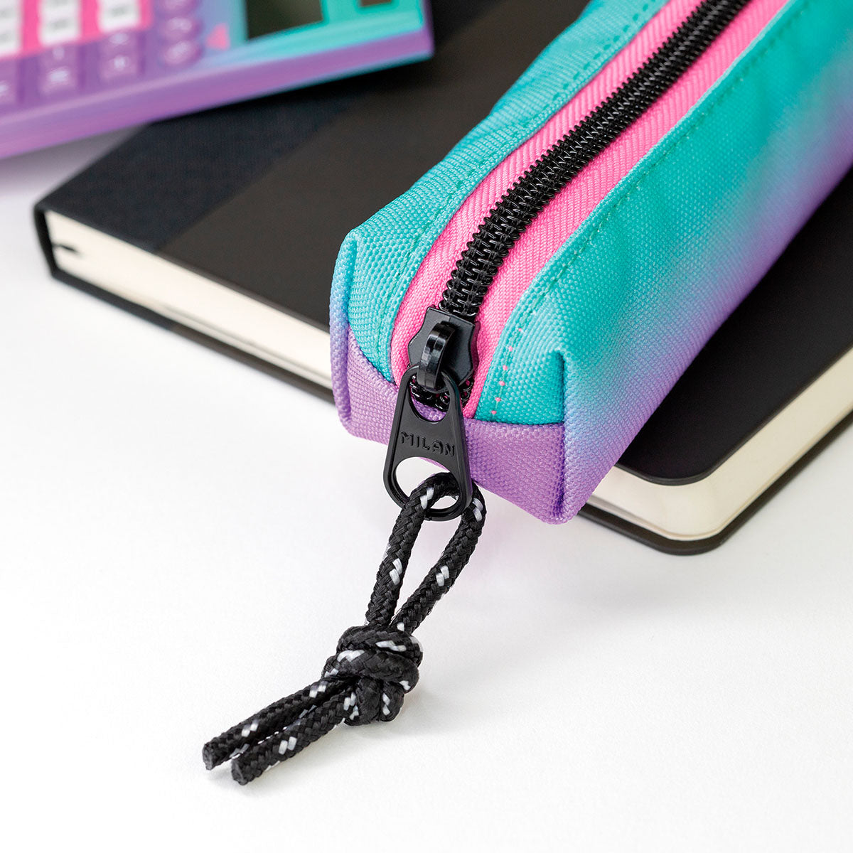 Estuche portatodo mini multiusos de la serie Sunset de MILAN, en una combinación de colores degradados inspirados en el atardecer verdes y morados, acompañados de detalles en blanco y negro.