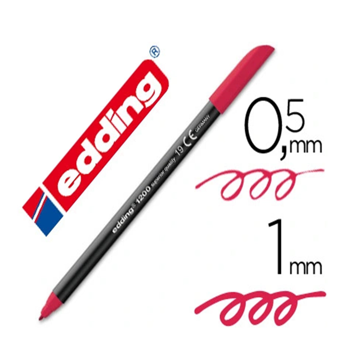 Rotulador de fibra Edding 1200, de trazo fino con punta redonda de 0.5 mm de grosor. La tinta del rotulador es a base de agua y resistente a la luz, con lo que se garantizan resultados duraderos sobre papel o cartulina de colores claros.