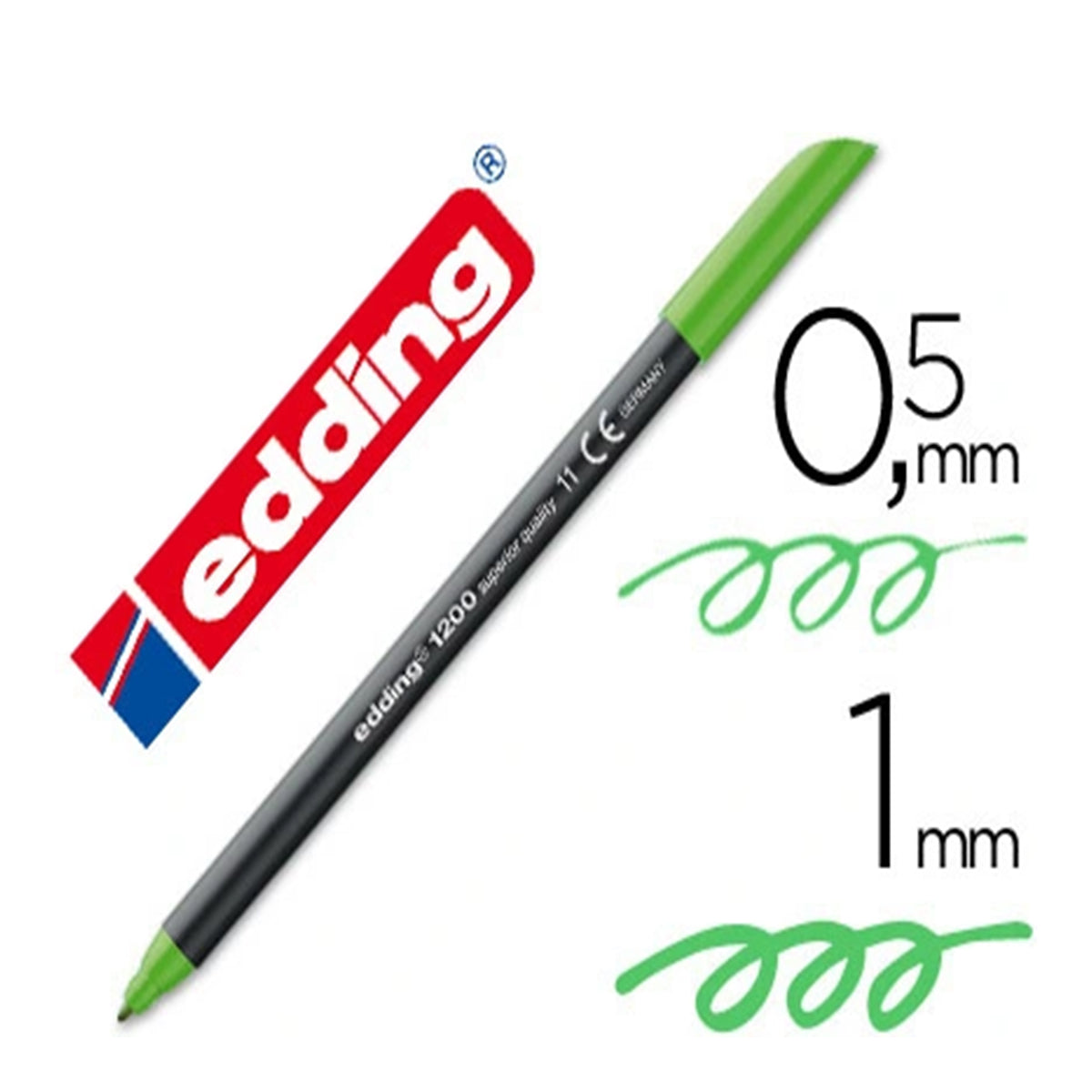 Rotulador de fibra Edding 1200, de trazo fino con punta redonda de 0.5 mm de grosor. La tinta del rotulador es a base de agua y resistente a la luz, con lo que se garantizan resultados duraderos sobre papel o cartulina de colores claros.