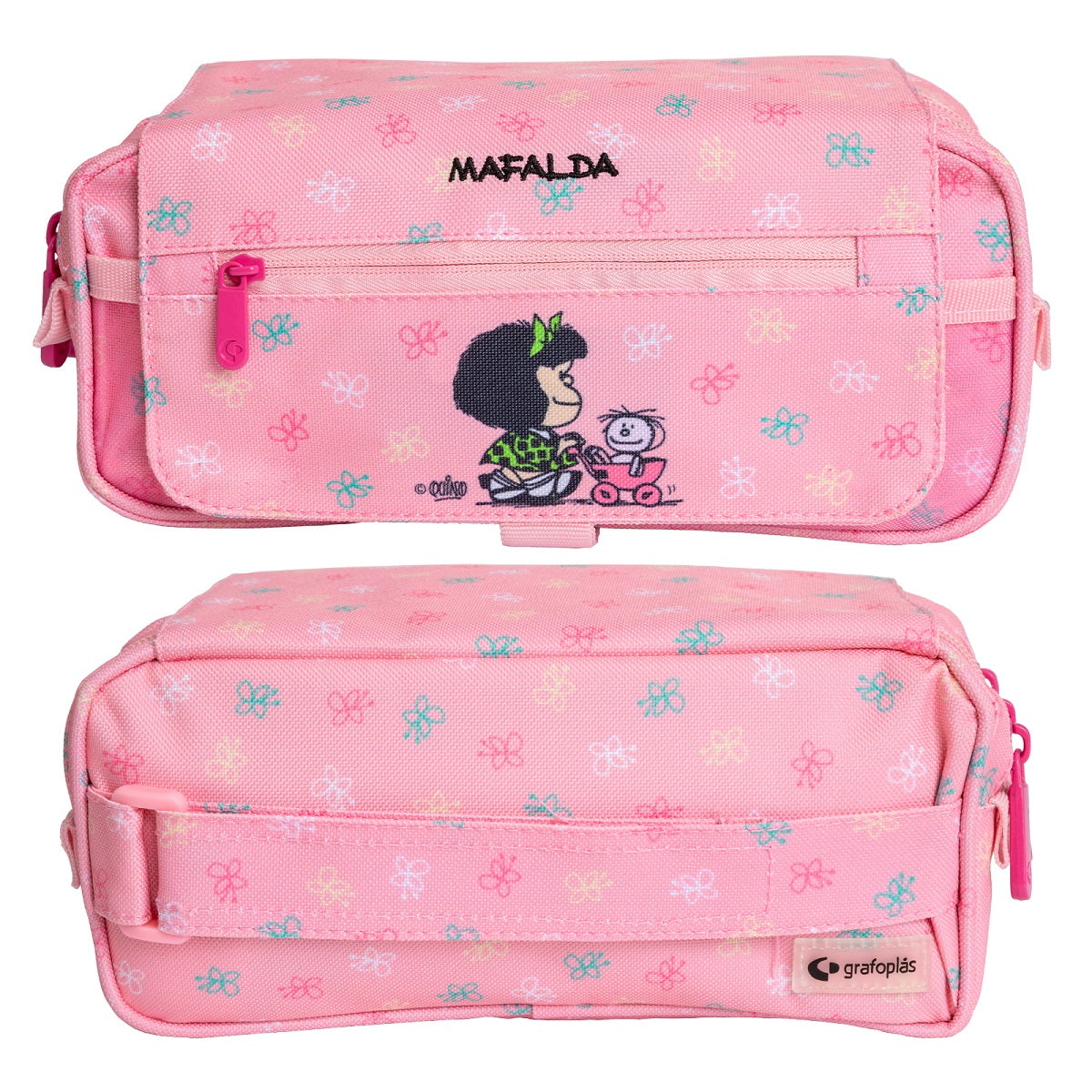 Estuche portatodo triple Grafoplás Bits and Bobs Design de amplios apartados y gran capacidad en formato rectangular. Cuenta con 3 cremalleras principales y una solapa exterior con tirador de tela y cierre de velcro. Además, cuenta con una tira trasera para poder colgarlo y con espacio para poder escribir tus datos personales.