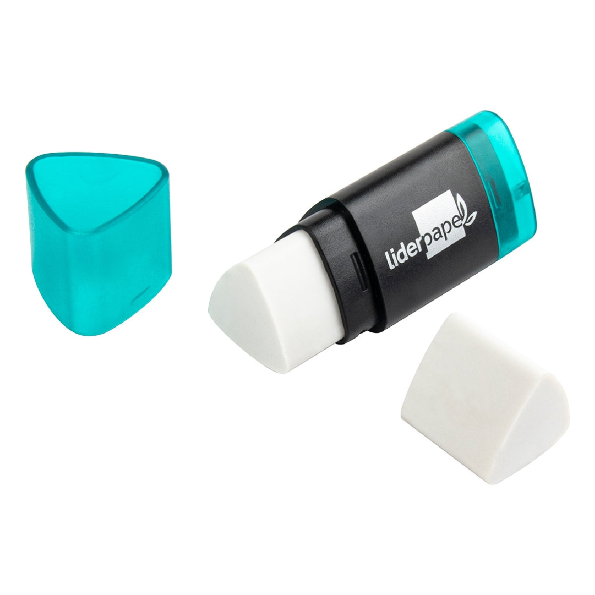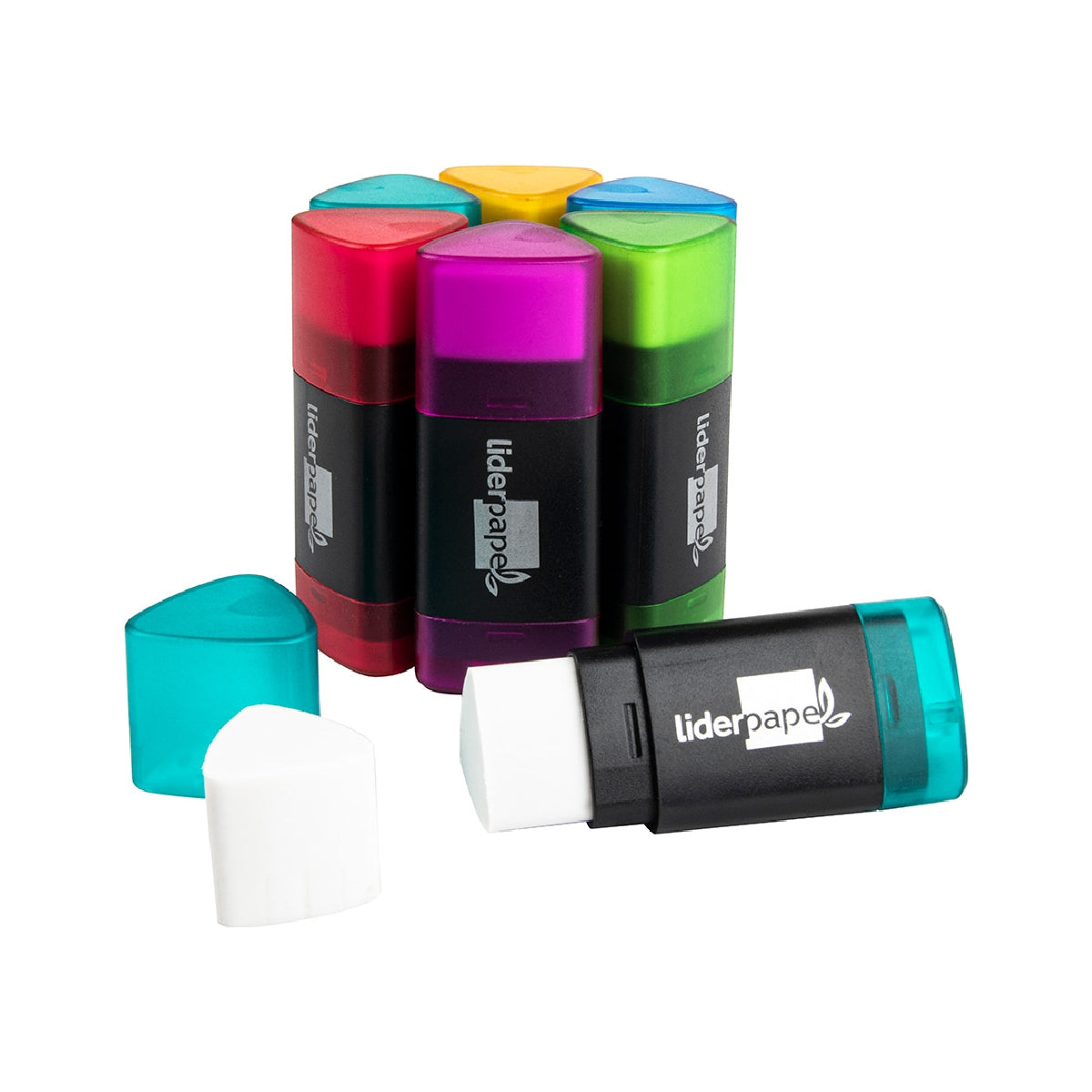 Sacapuntas de plástico con depósito y goma de borrar triangular. Colores surtidos: azul. fucsia. lila. naranja. turquesa y verde. Goma ecológica sin pvc. Un uso.
