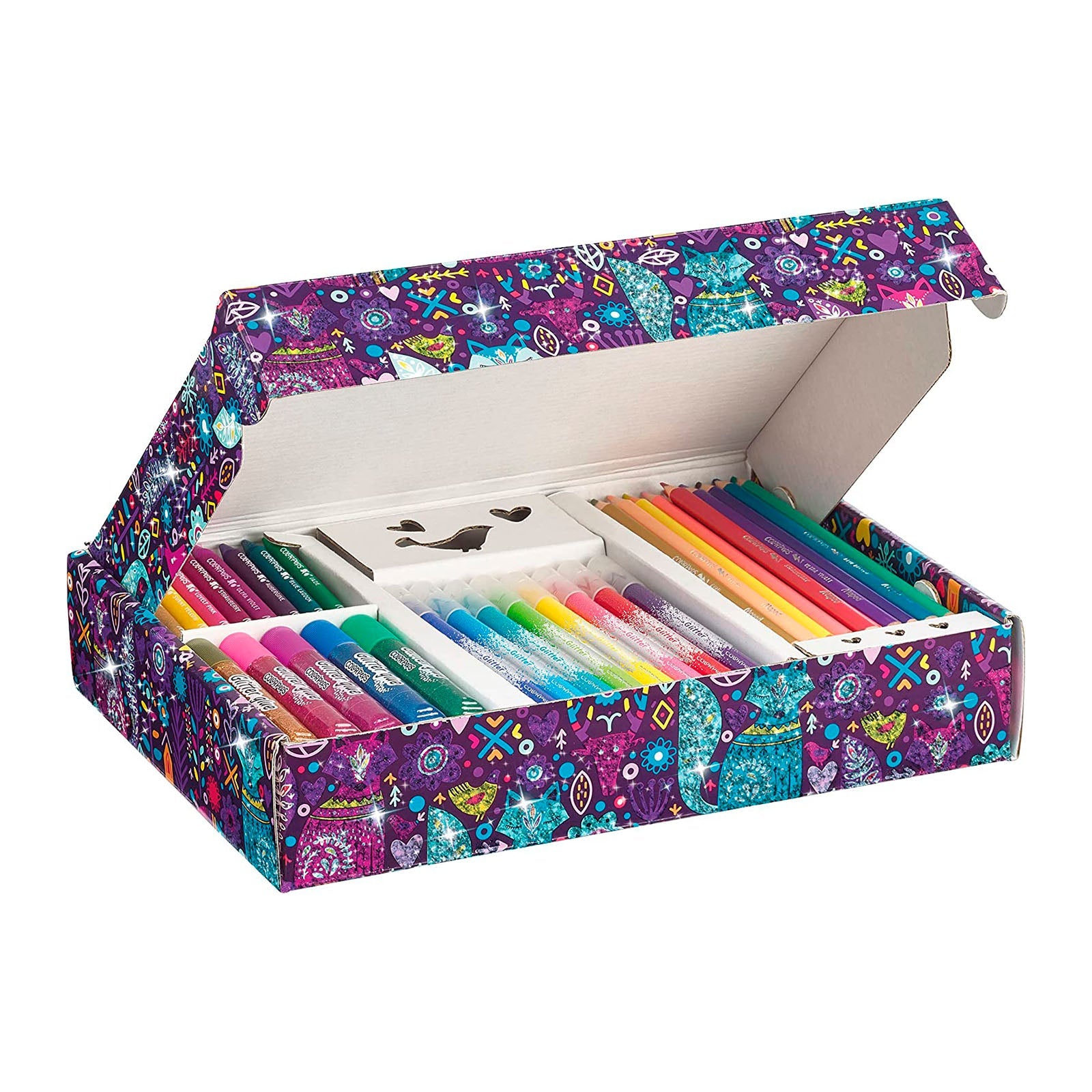 Todos los componentes vienen presentados en una caja con decoraciones de estilo bohemio muy brillantes y llamativas. Así podrán tener siempre bien organizado y a buen resguardo sus materiales artísticos.