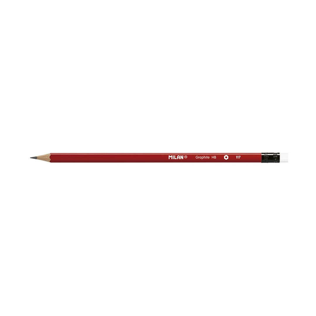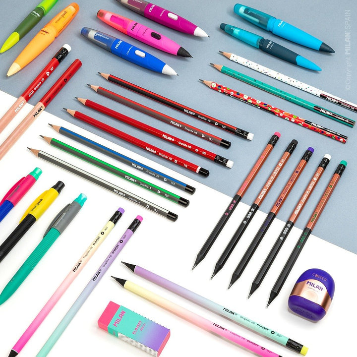 Lápices de grafito HB con goma. Mina de 2.2 mm Ø. Forma hexagonal. La graduación HB en una dureza de grafito media, recomendada para escritura y dibujo. La mina ofrece un trazo uniforme y resistente a la rotura, gracias al sistema LPS (Lj Protection System) que protege la mina gracias a su adhesión con la madera. Madera procedente de plantaciones sostenibles.