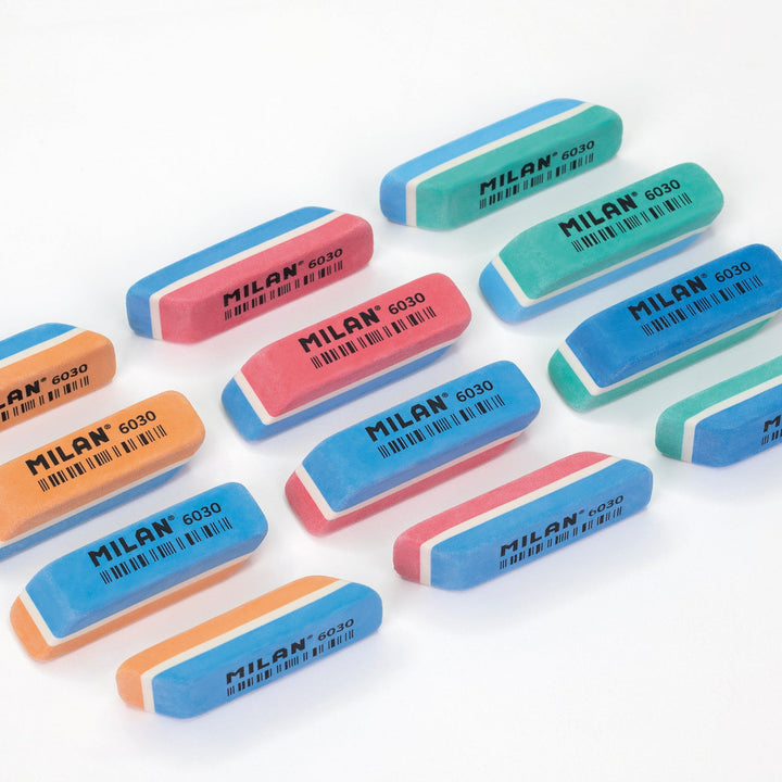 Caja de 30 Gomas de Borrar Miga de Pan Flexible 6030. Goma de caucho sintético flexible biselada y bicolor, para borrar lápiz sobre todotipo de superficies. Colores surtidos: azul, naranja, rojo y verde. Las gomas de borrar MILAN están fabricadas en España desde 1918.