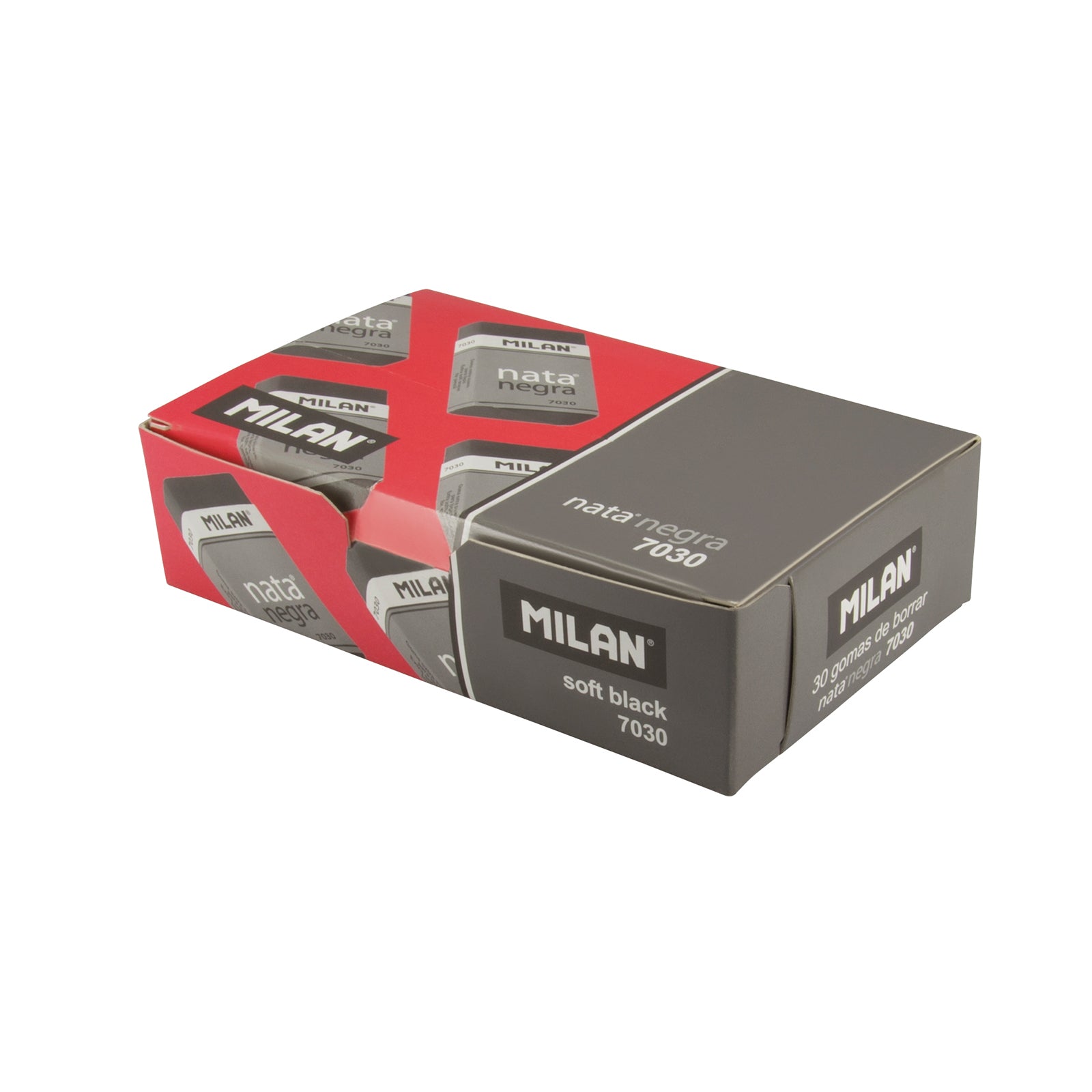Caja de 30 Gomas de Borrar Nata Negra 7030. Goma extra suave con gran poder de adsorción, adecuada para borrar trazos de lápices blandos sin mancha. Gomas con faja de cartón y envuelta individualmente. Las gomas de borrar MILAN están fabricadas en España desde 1918.