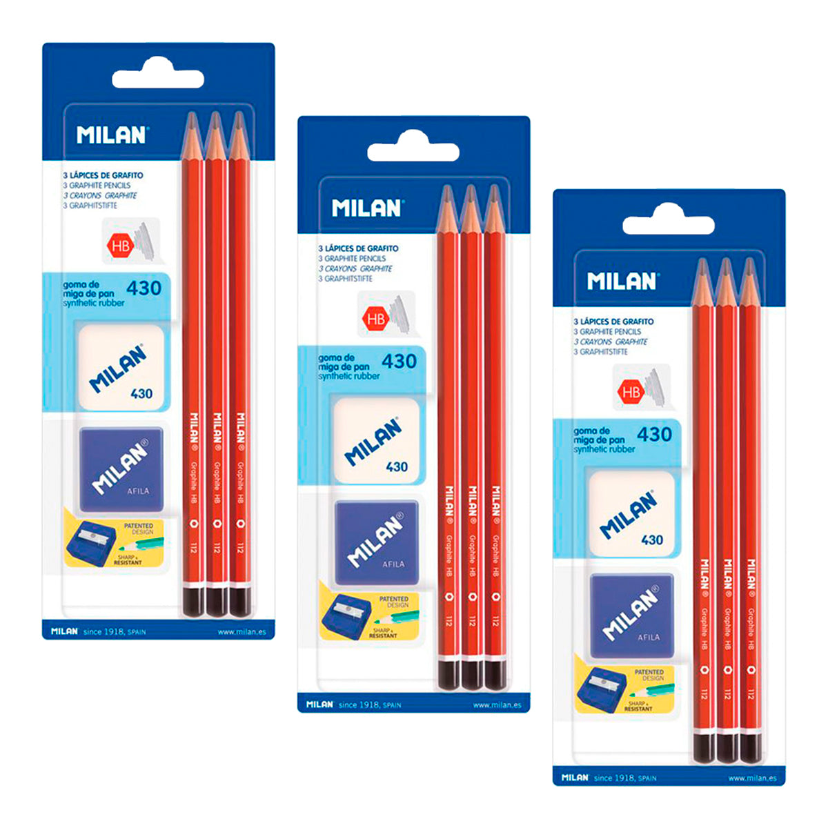 3 Gomas de borrar 430, suave de caucho sintético tipo "miga de pan" cuadrada. Para borrar una amplia gama de lápices de grafito sobre toda clase de papeles. 3 Sacapuntas AFILA estándar sin depósito, tiene una cuchilla de acero al carbono afilada y resistente, ideal para todo tipo de lápices.
