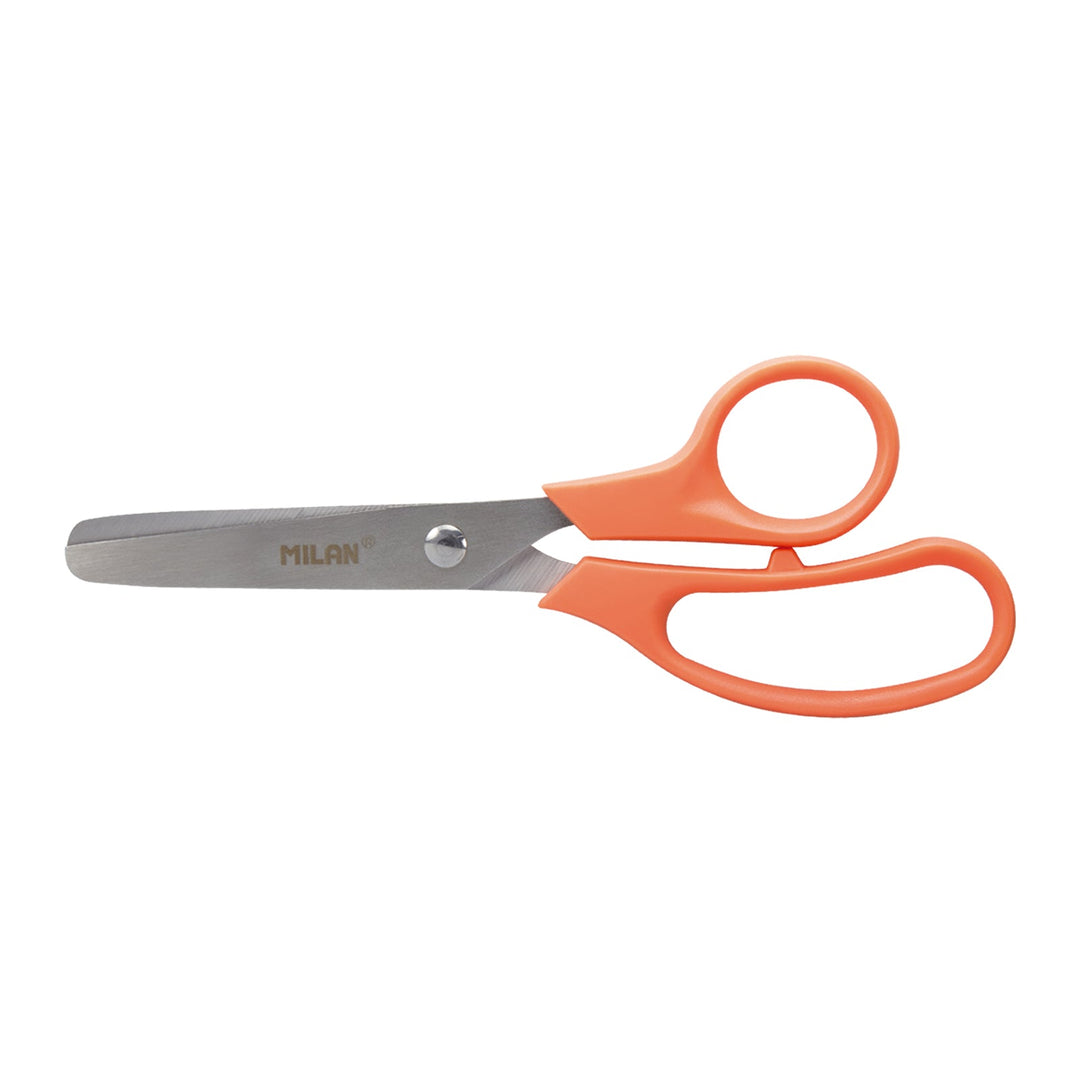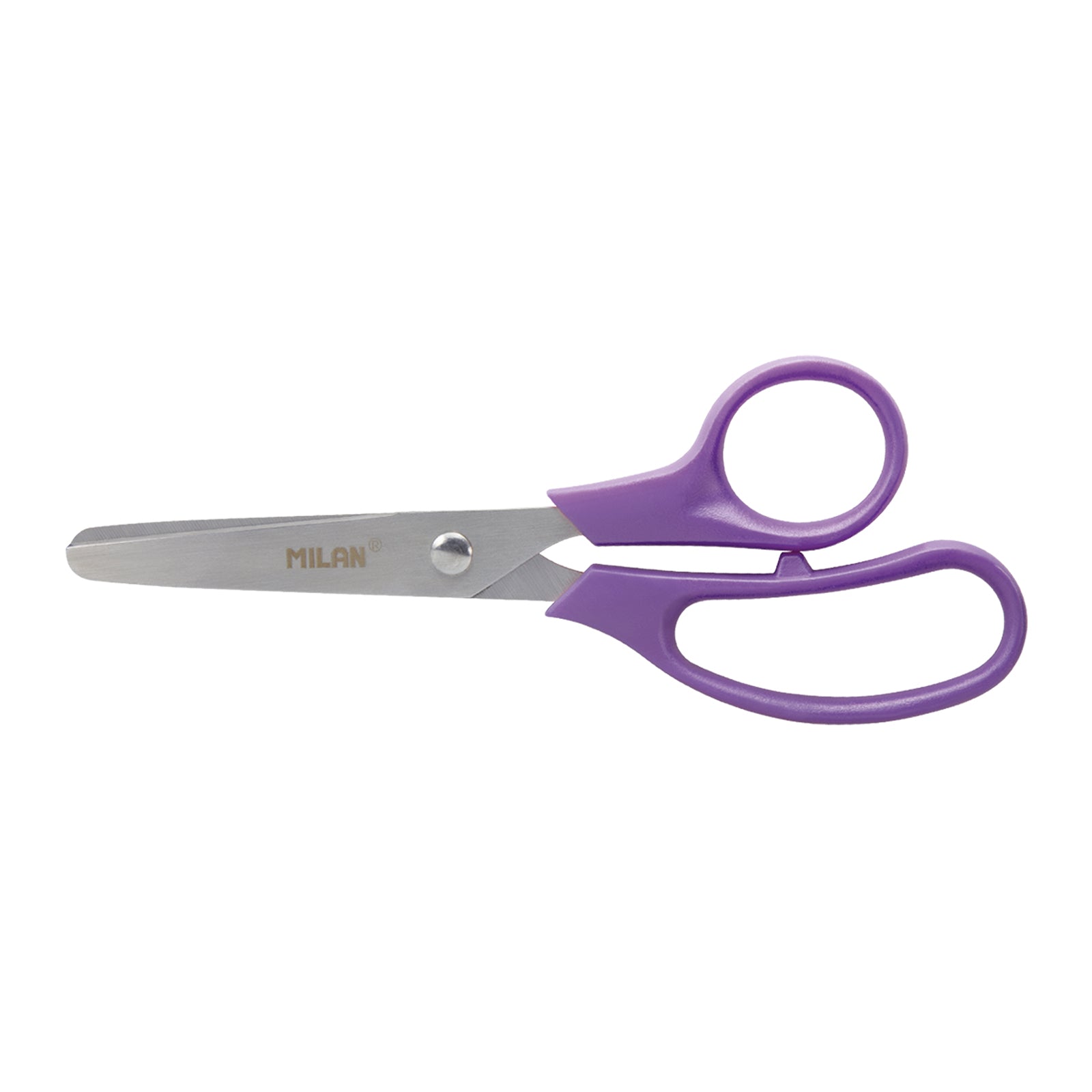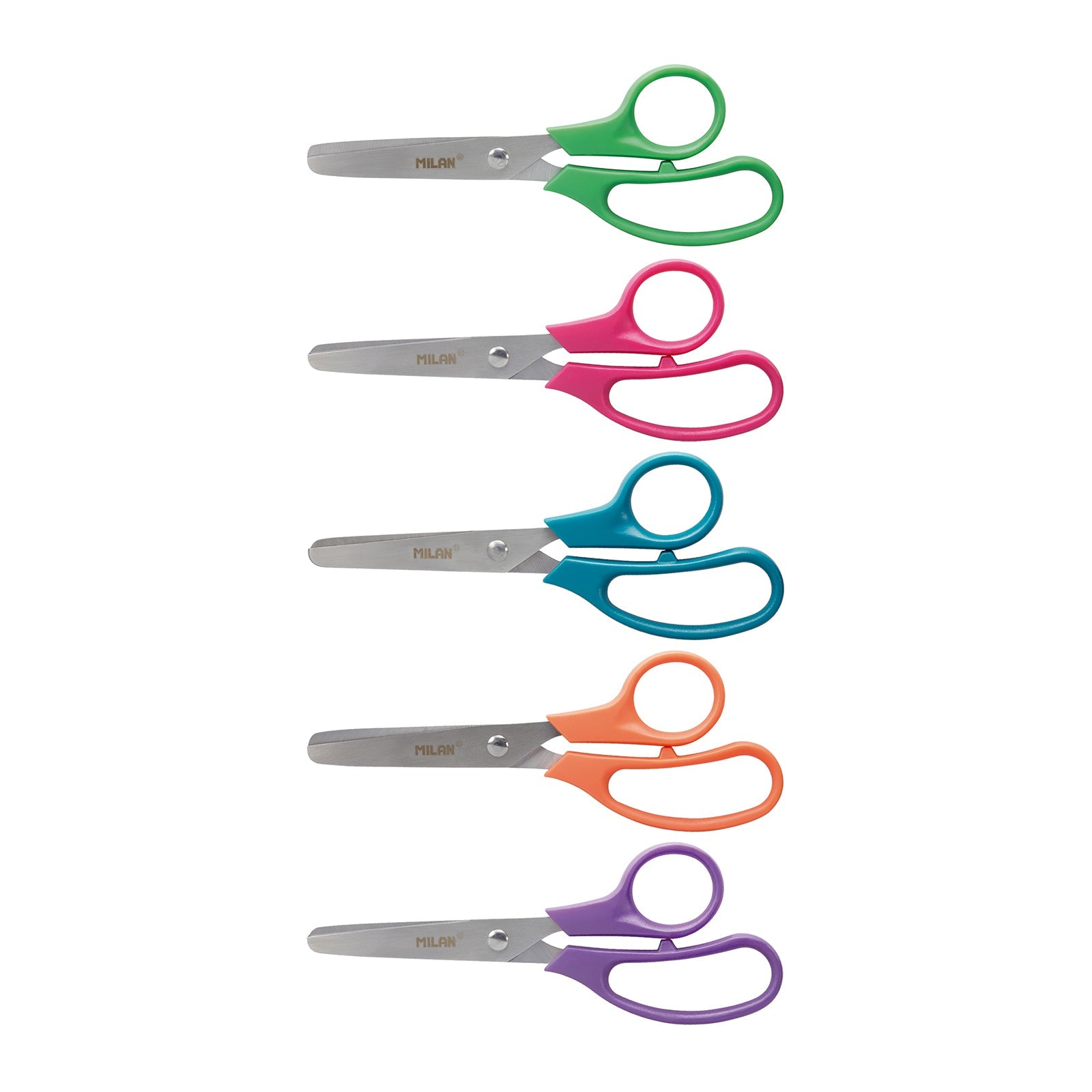 Tijeras escolares con cuchilla de acero inoxidable y punta redondeada. Mango de plástico. Ideales para uso escolar. Colores surtidos: azul, lila, naranja, rosa y verde