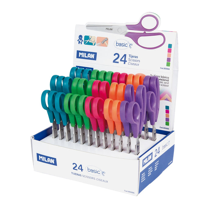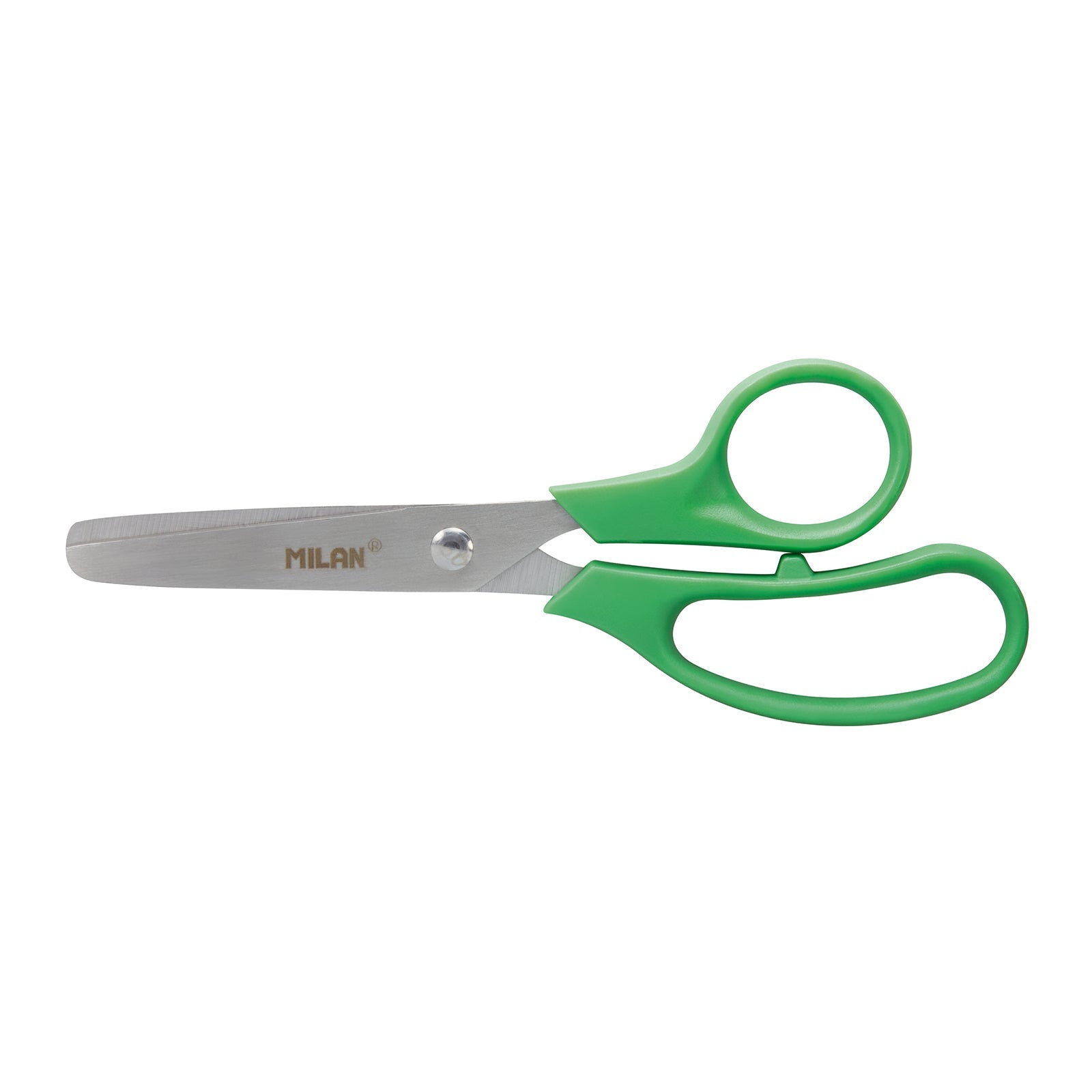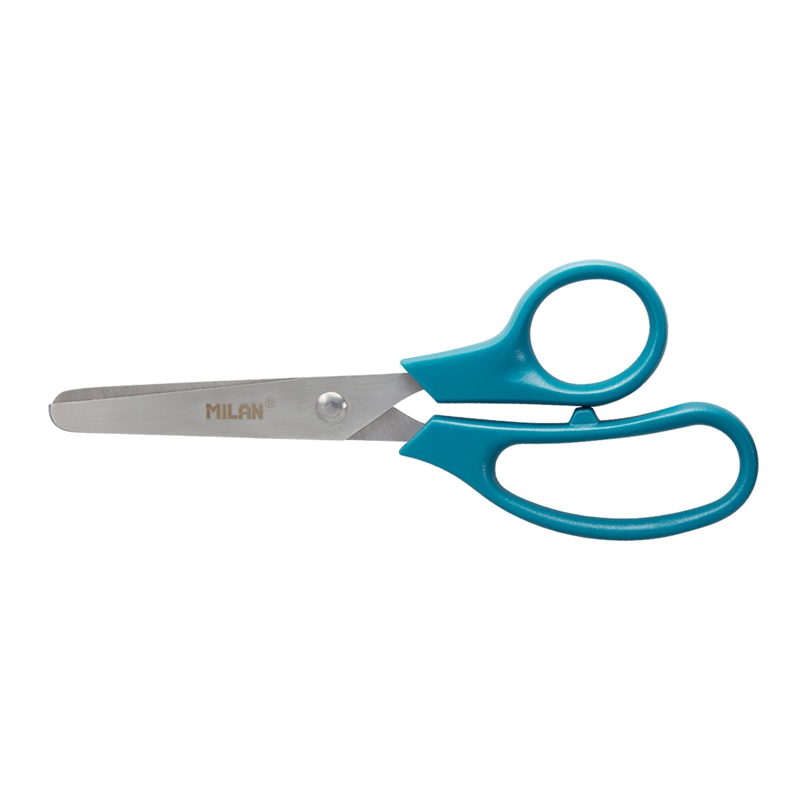 Tijeras escolares con cuchilla de acero inoxidable y punta redondeada. Mango de plástico. Ideales para uso escolar. Colores surtidos: azul, lila, naranja, rosa y verde