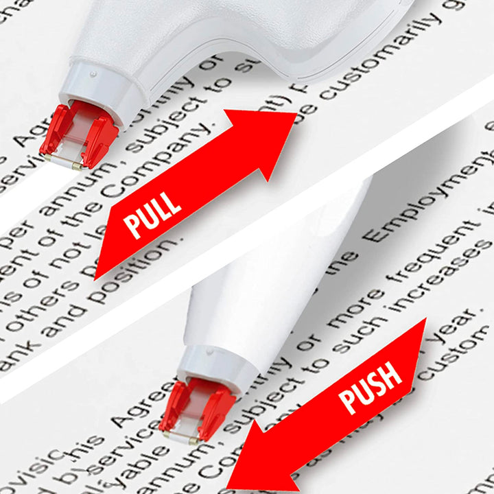Tiene dos sentidos de corrección: deslizar para una frase y presionar para una letra. Cuenta con capuchón protector en el extremo para no estropear la cinta. Permite una reescritura inmediata, incluso con tinta líquida o gel.
