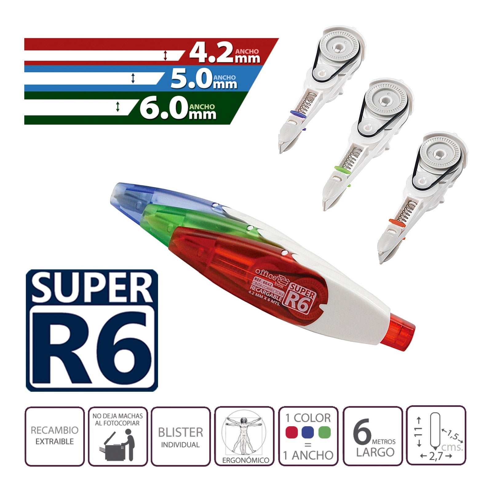 Pack de 2 cintas correctoras SDI Super R6 de 4.2 mm de ancho. Tienen un diseño ergonómico y cuentan con un pulsador para poder esconder en extremo evitando así que se estropee la cinta cuando no se está usando.
